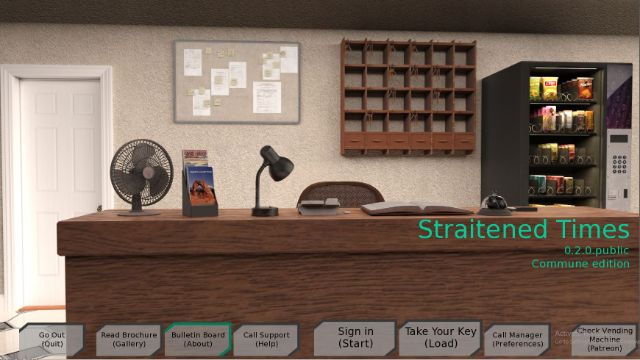 In Straitened Times It’s a game about a young guy living together with a small Commune of Mother superior, holy Father and two novice Sisters (none red-fluid related). One day his happy life was over when Father was arrested for financial thievery and your Commune has to start once over from the bottom. And the bottom is 2 rooms in a shady motel – the only place they could afford.